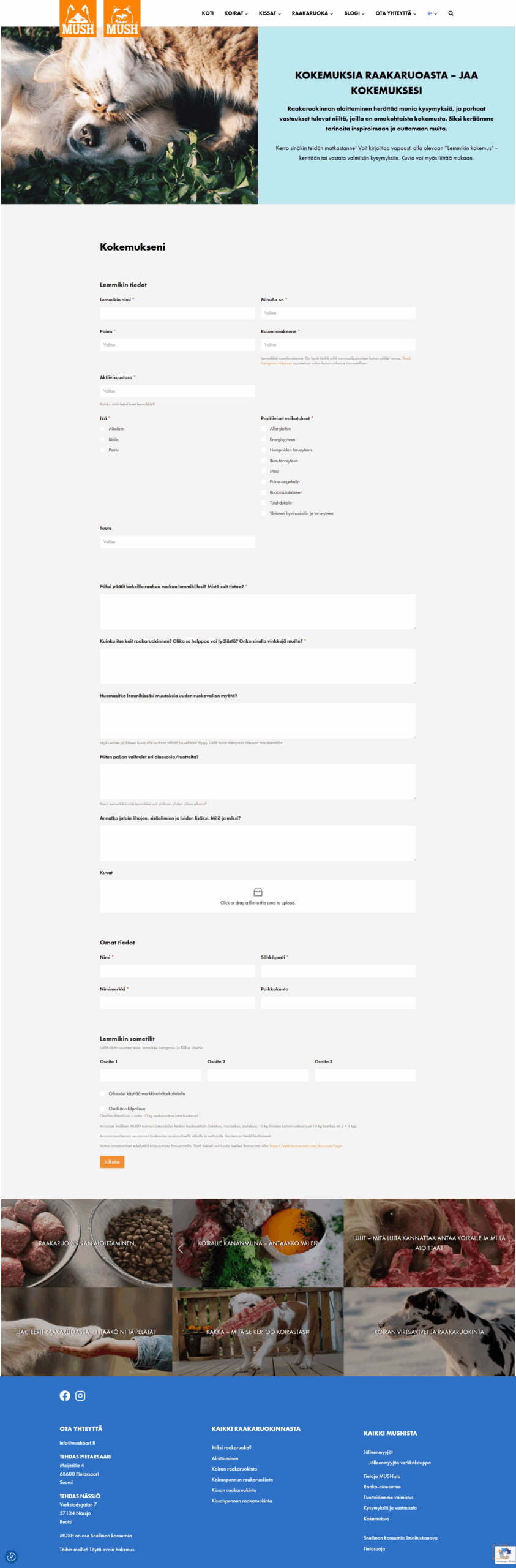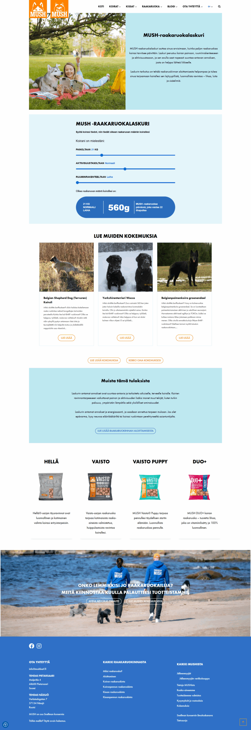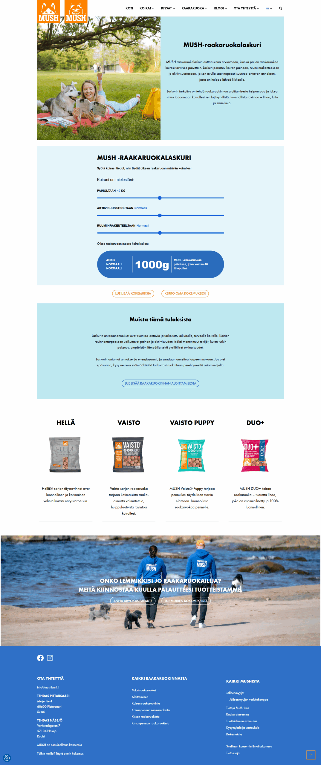 MUSH raakaruokalaskuri auttaa selvittämään, kuinka paljon raakaruokaa koirasi tarvitsee päivittäin. Laskurin antama tulos perustuu koiran painoon, ruumiinrakenteeseen ja aktiivisuustasoon. Saat helposti ja nopeasti suuntaa-antavan annoksen, josta on helppo lähteä liikkeelle.