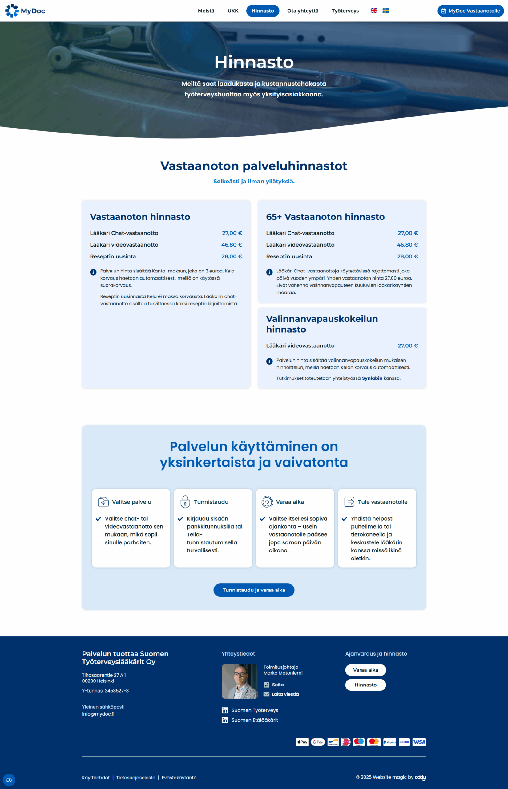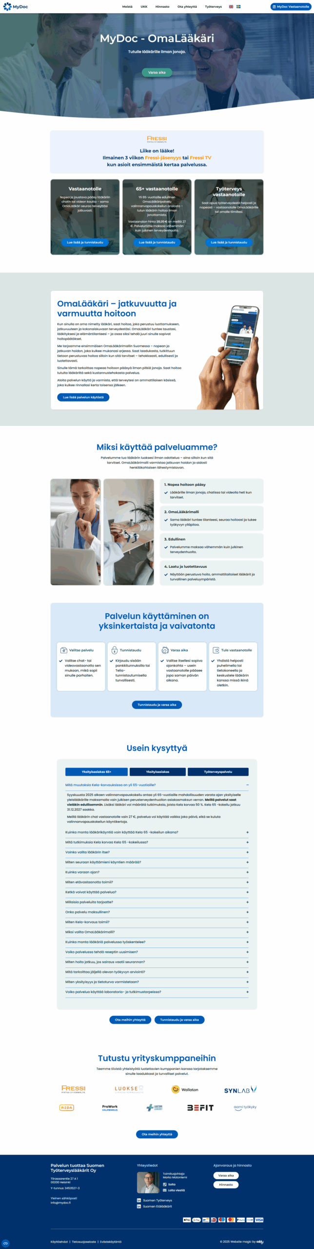Oddy pääsi uudistamaan MyDocin verkkosivut vastaamaan palvelun selkeää ja asiakaslähtöistä ideaa. Uusi ilme ja yksinkertainen rakenne tekevät asioinnista helppoa – aivan kuten itse palvelukin. Verkkosivujen keskiössä ovat nyt asiakkaan hyödyt, toimiva palvelulupaus ja sujuva yhteydenotto.